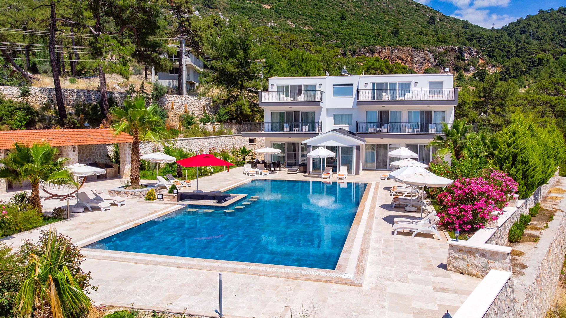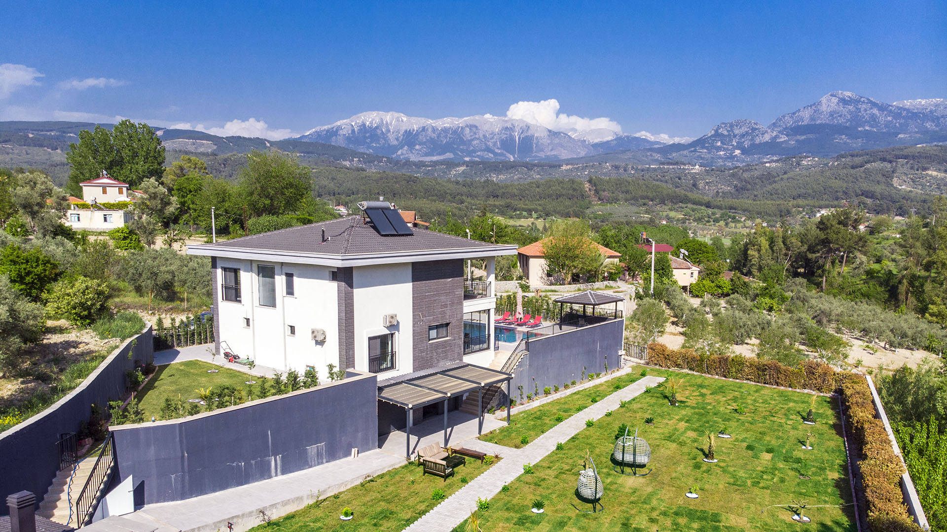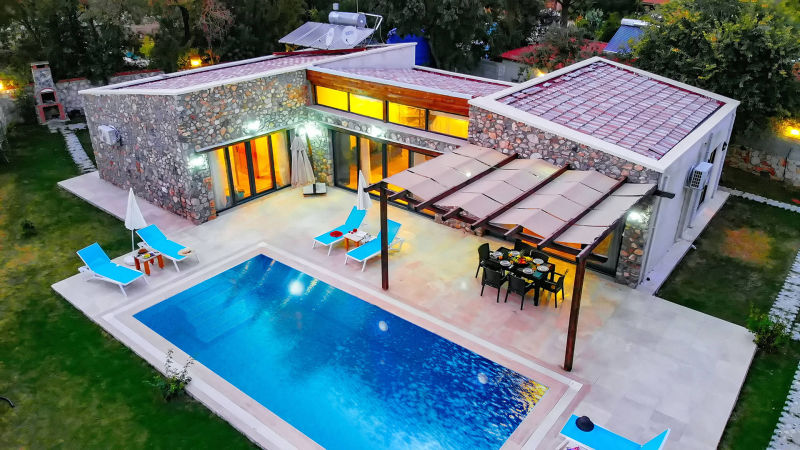 Drone ile yapılan dış mekan fotoğraf ve video çekimlerinde, villanın genel görüntüsünü ve konumunu anlamnıza yardımcı olur,